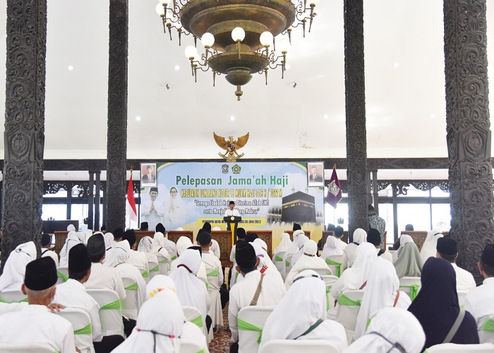 Bupati Lumajang, Thoriqul Haq dan Wakil Bupati Lumajang, Indah Amperawati Masdar melepas 348 orang jamaah haji Kabupaten Lumajang Kloter 18 musim haji 1443 H/2022 di Pendopo Arya Wiraraja Kabupaten Lumajang, Kamis (9/6).